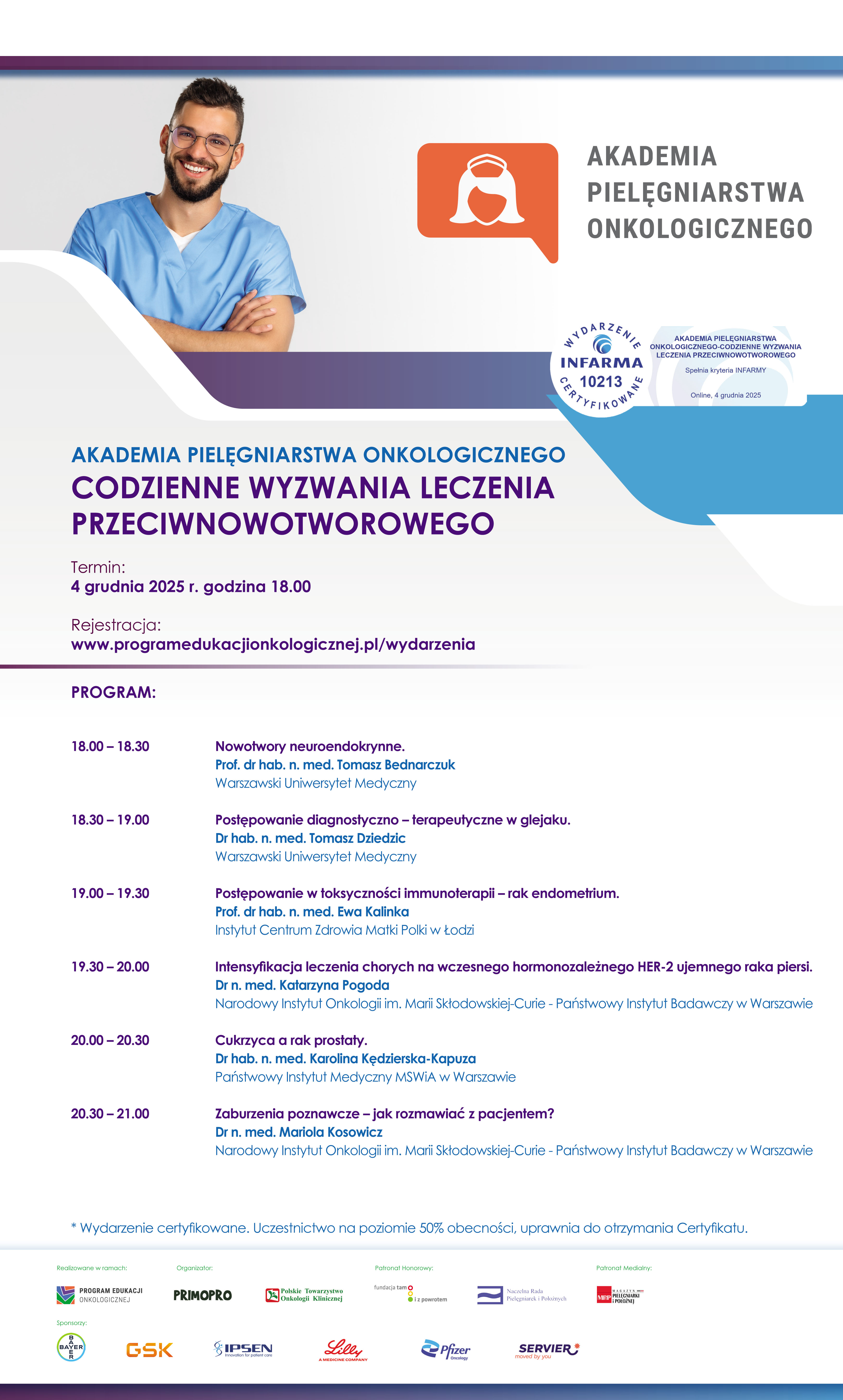 w imieniu Polskiego Towarzystwa Onkologii Klinicznej - organizatora Programu Edukacji Onkologicznej, w ramach którego działa Akademia Pielęgniarstwa Onkologicznego - serdecznie zapraszamy do bezpłatnego udziału w webinarium: