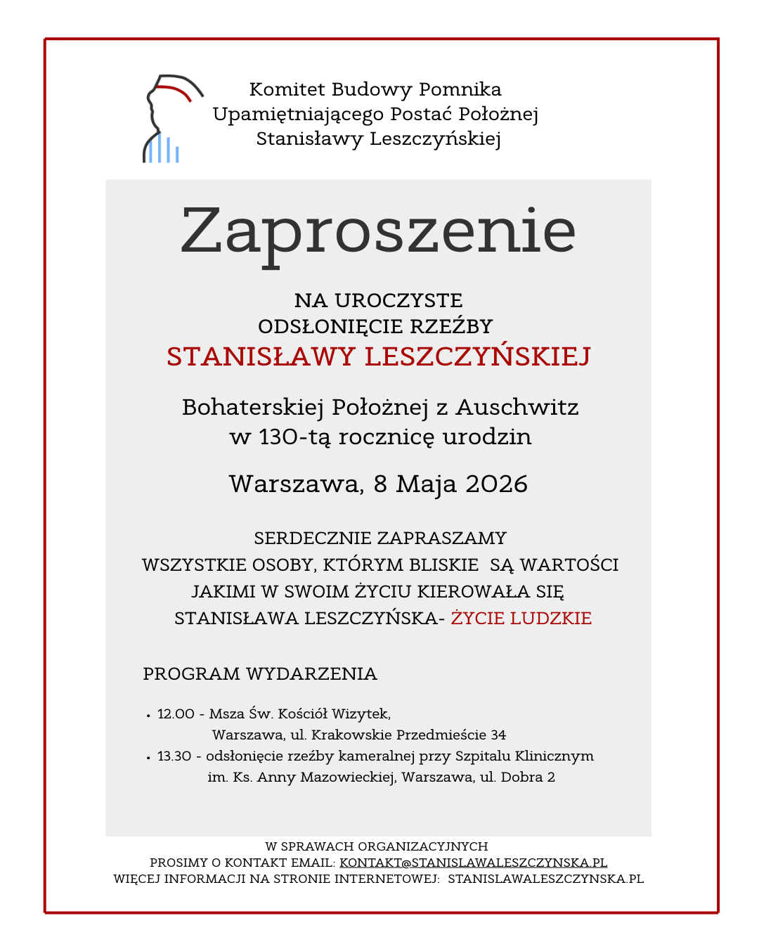 Zapraszamy na uroczyste odsłonięcie rzeźby Stanisławy Leszczyńskiej - Bohaterskiej Położnej z Auschwitz w 130-tą rocznicę urodzin. Warszawa, 8 Maja 2026.