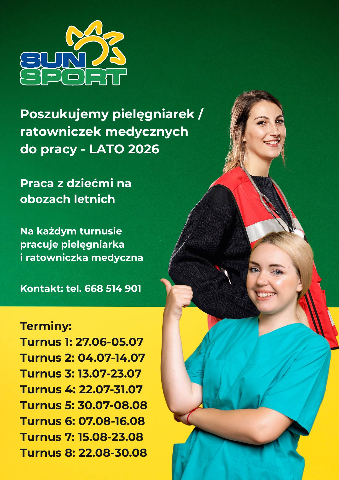 Jako właściciele dwóch nowoczesnych ośrodków Sun Sport w Mrówkach i w Giewartowie, w których od lat organizujemy letnie obozy dla dzieci i młodzieży, zapraszamy do współpracy Pielęgniarki zainteresowane sezonową pracą w wybranych terminach obozów: